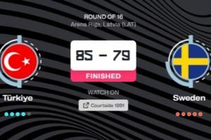 第三节,土耳其找回了自己的节奏,单节净胜13分,将战局的优势扳回到了自己手上。末节,瑞典再度发力一度将比分追平,但土耳其依靠全队的出色表现,稳稳拿下比赛,晋级八强。