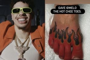 这个纹身是纹在脚背、脚趾背部相连处,然后是一个火焰图案。纹身师还配文:"给拉梅洛做了个‘火辣芝士脚趾’纹身。"