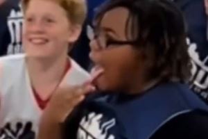 在与欧文完成击掌后,两位小球迷在镜头前兴奋地舔起了手。