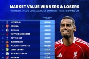 英超夏窗身价变化:利物浦+2.54亿 阿森纳+2.25亿 切尔西+1.69亿